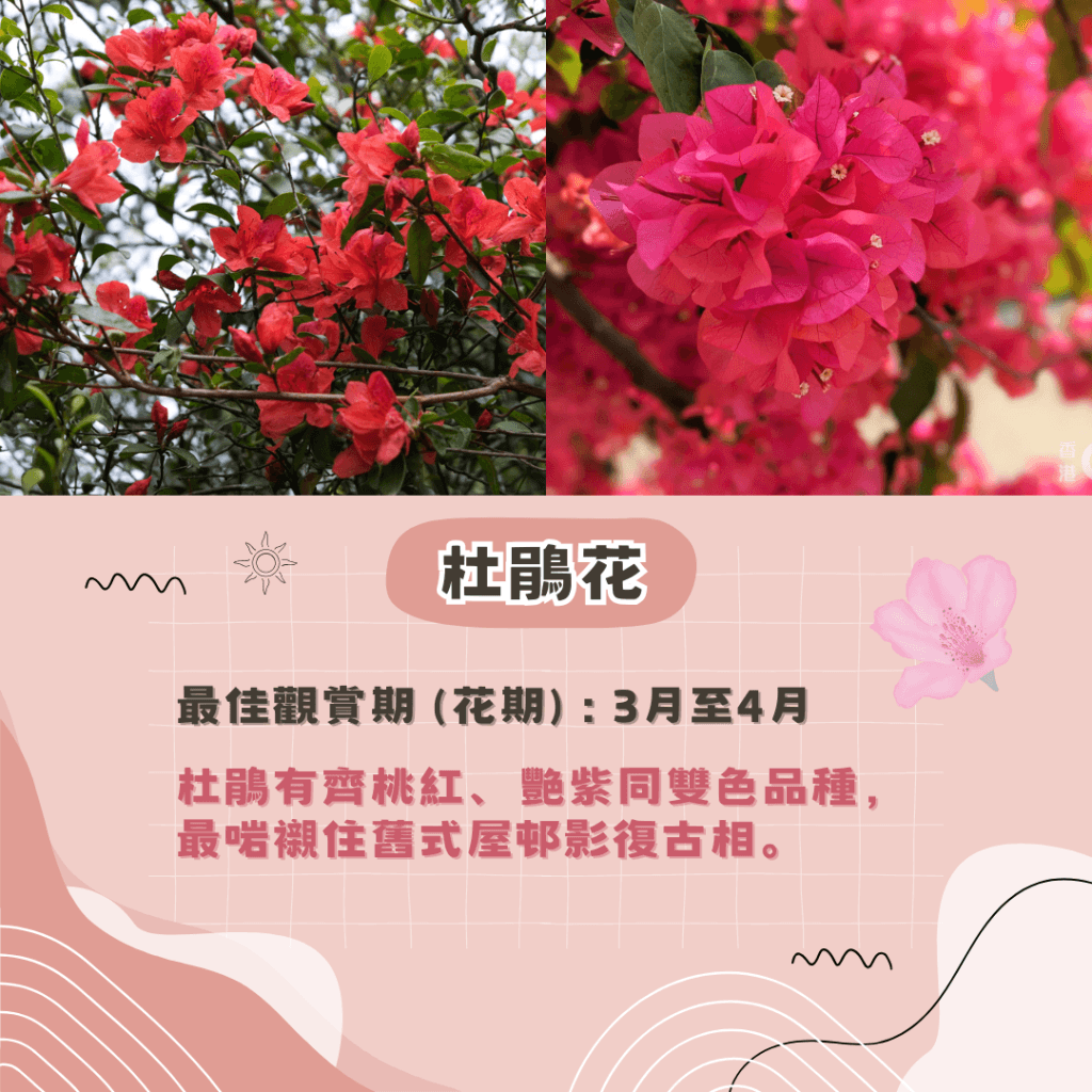 介紹 | 杜鵑花在香港亦稱為「山茶花」,是香港常見的灌木植物,花色多樣,有紅、粉、白等顏色 |