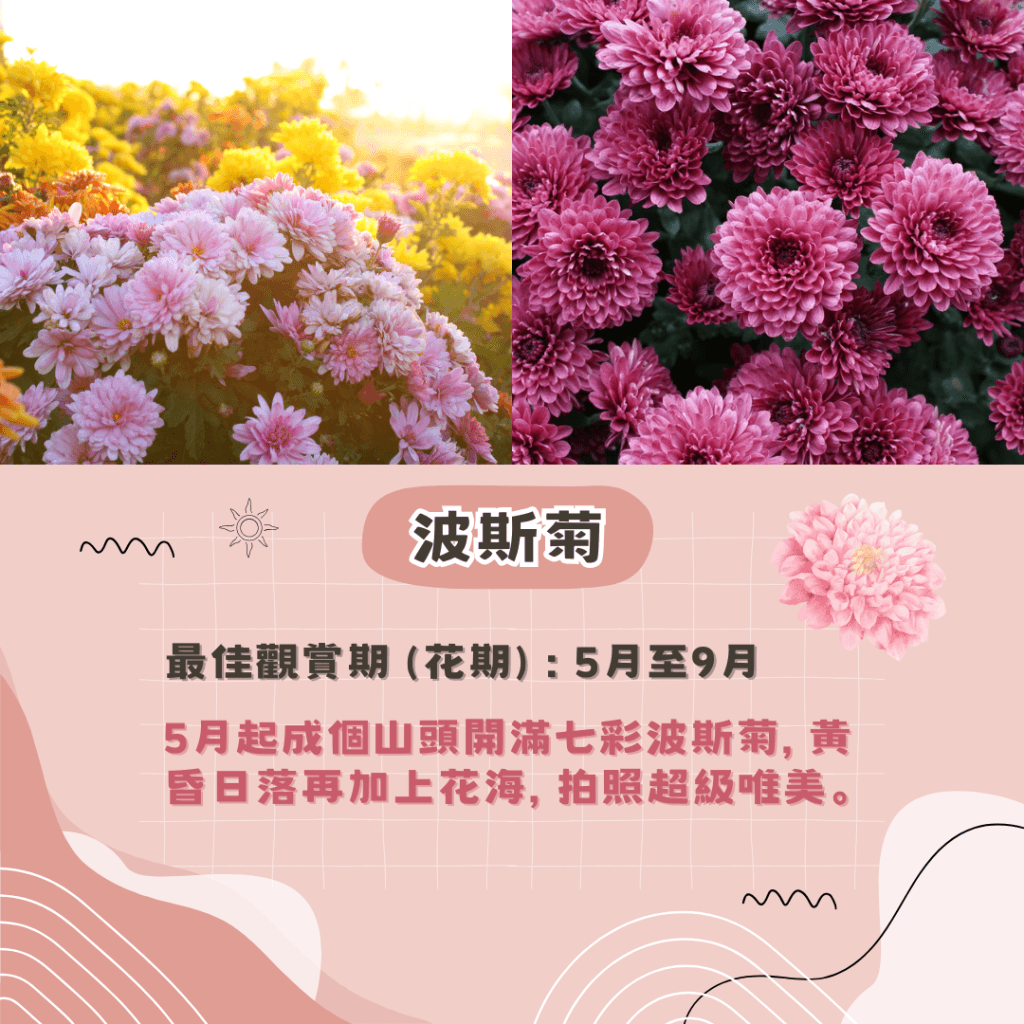 想睇到9月都有花?去元朗錦田鄉村俱樂部啦!5月起成個山頭開滿七彩波斯菊,黃昏日落再加上花海,拍照超級唯美。(小貼士:著淺色衫影相更突出,下晝4點後光線最柔和~) 俱樂部仲提供田園燒烤、寵物樂園、士多啤梨樂園、兒童樂園等,玩足全日都唔怕悶呀。建議自駕或搭64K巴士到蒙養小學站。