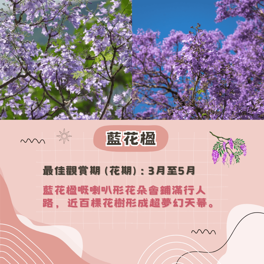 4-6月全港進入「紫爆」狀態!藍花楹嘅喇叭形花朵會鋪滿行人路,最有名係維多利亞公園中央草坪 - 銅鑼灣站E出口直達,花樹形成超夢幻天幕,無論近看/遠看都好夢幻,記得周末早上去避開野餐人潮!其他靚點:沙田公園 (城門河倒影)、荔枝角公園 (嶺南之窗打卡位)、屯門三聖邨 (海鮮街食完即賞花)