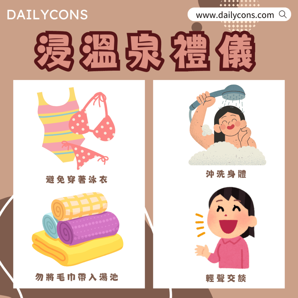在泡湯時,手上的毛巾要放在池邊,避免將毛巾帶入湯池,保持水質的清潔。 - 注意個人衛生