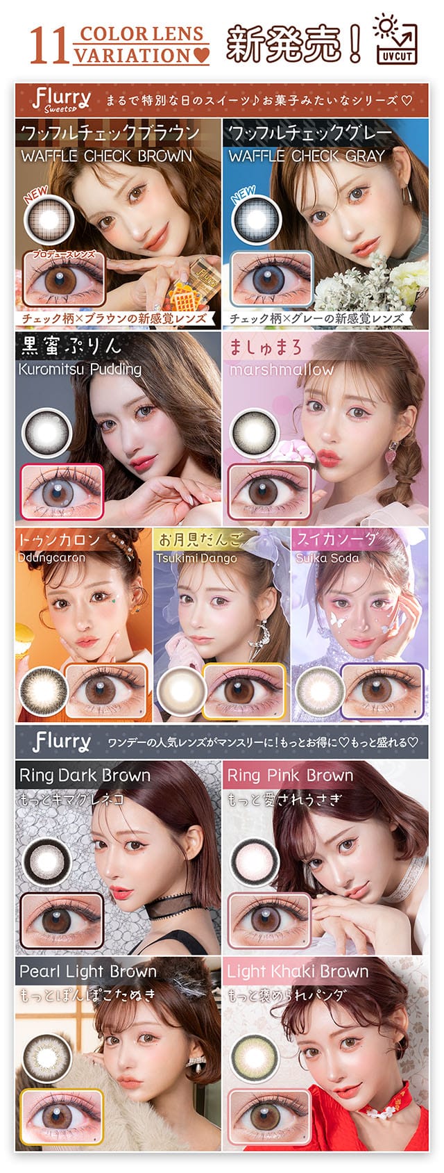 Flurry Monthly 每月即棄型特大眼彩 Con,由日本女星明日花綺羅策劃並代言,以模仿小動物的萌點為特色,著色直徑高達 14.3mm!